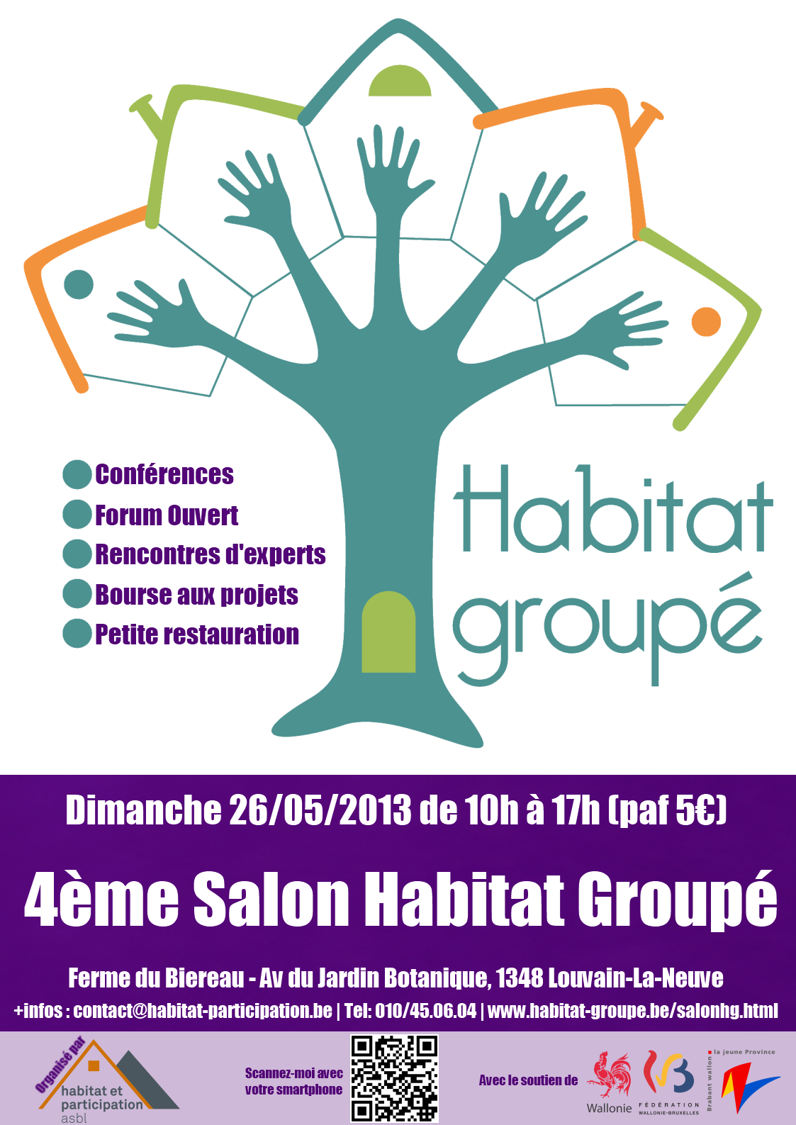Cette année aura lieu le quatrième salon de l’habitat groupé. Ce salon sera l’occasion pour le grand public de rencontrer différents professionnels du secteur : notaires, architectes, porteurs de projet, juristes, spécialistes de projets intergénérationnels et pour personnes âgées, conseillers en auto-construction, entrepreneurs en éco-construction, auteurs de livres sur le sujet,… ainsi qu’une exposition sur l’habitat groupé. Nouvelle activitée cette année : le Forum Ouvert ! Une bourse aux projets permettra, aux personnes intéressées, de trouver un habitat groupé !